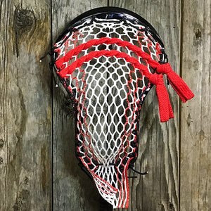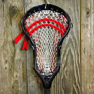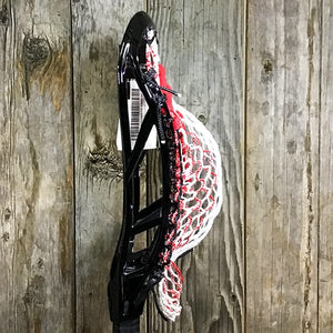 Lacrosse Fanatic custom strung this Chrome Black Adrenaline Automatic Mens Lacrosse Head with red striker Hero 4 mesh and black strings. It features our signature Mikie Schlosser (PLL Waterdogs) designed pocket. It's stylish and game ready out of the gate. Just throw it on your favorite shaft and go make plays.
