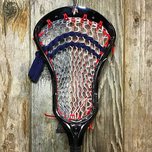 Lacrosse Fanatic custom strung this Chrome Black Adrenaline Nomad Mens Lacrosse Head with USA mesh, red sidewall and navy shooter strings. It features our signature Mikie Schlosser (PLL Waterdogs) designed pocket. It's stylish and game ready out of the gate. Just throw it on your favorite shaft and go make plays.
